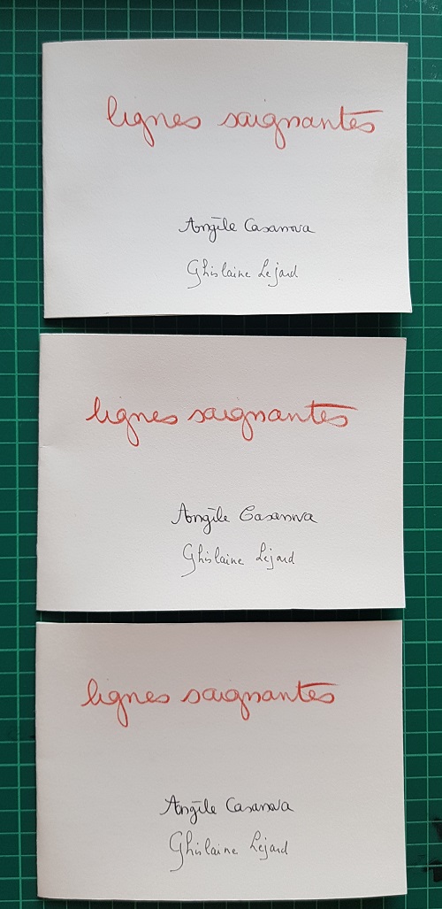 Lignes saignantes, un livre d’artistes par Angèle Casanova (poème) et Ghislaine Lejard (collages), 2019.